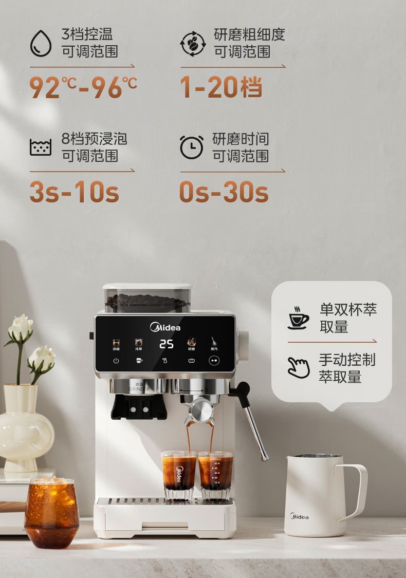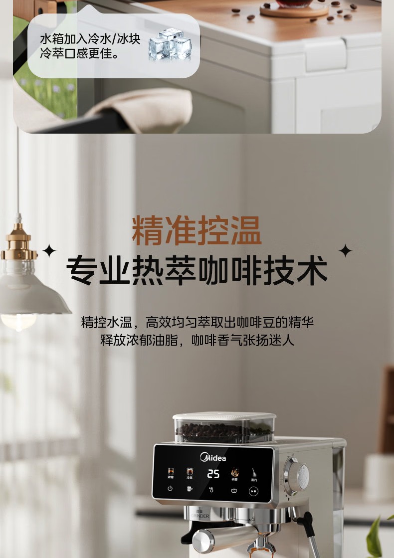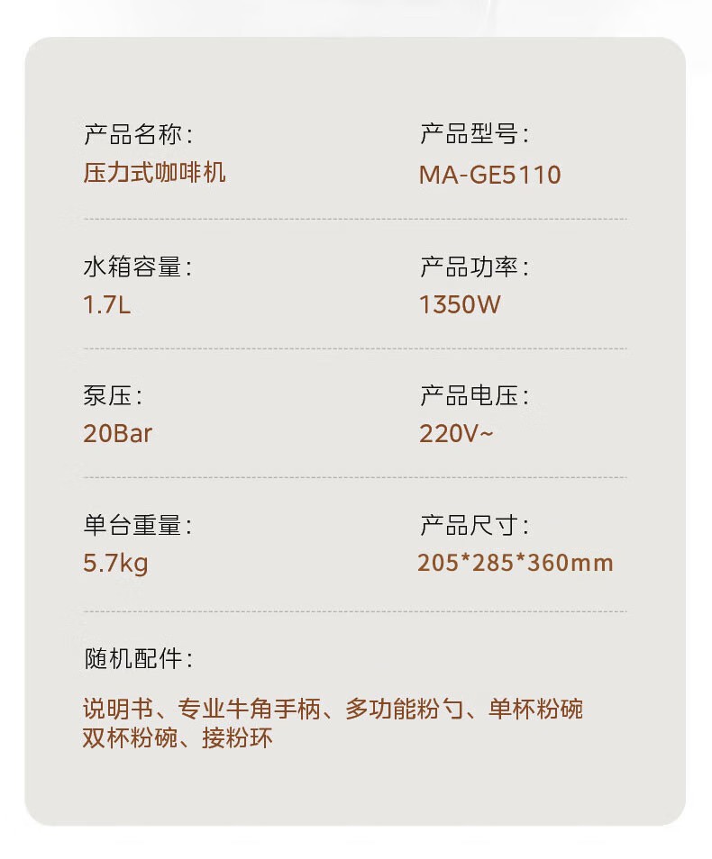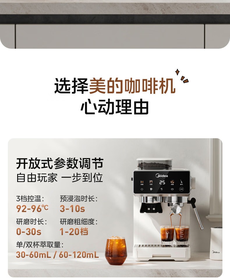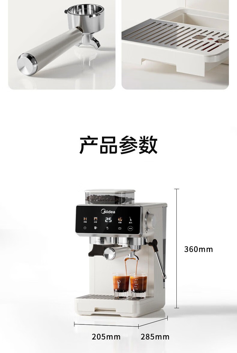 美的(Midea)半自动咖啡机家用意式研磨一体机全自动咖啡机MA-GE5110 产品尺寸:长285mm;宽205mm;高360mm