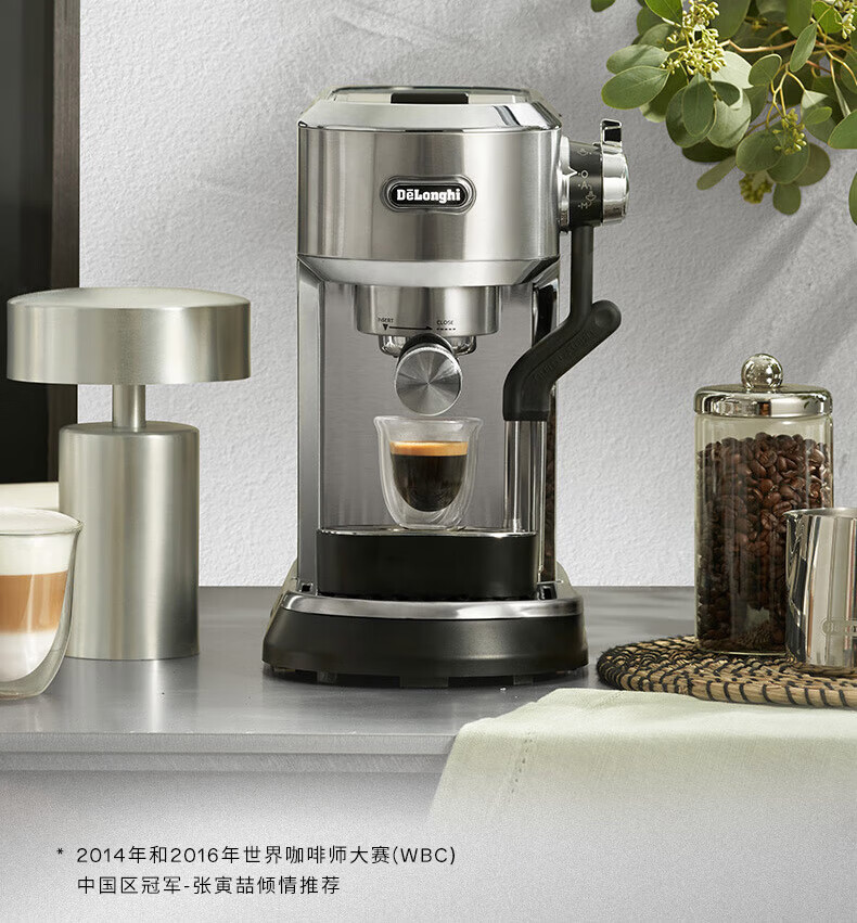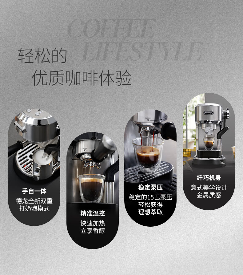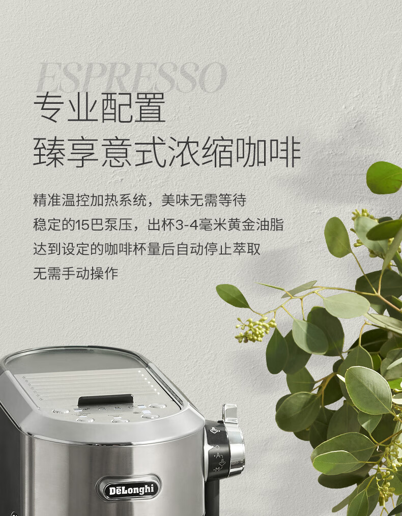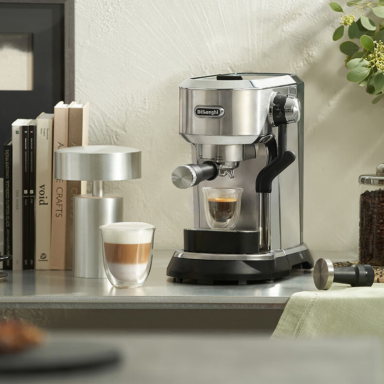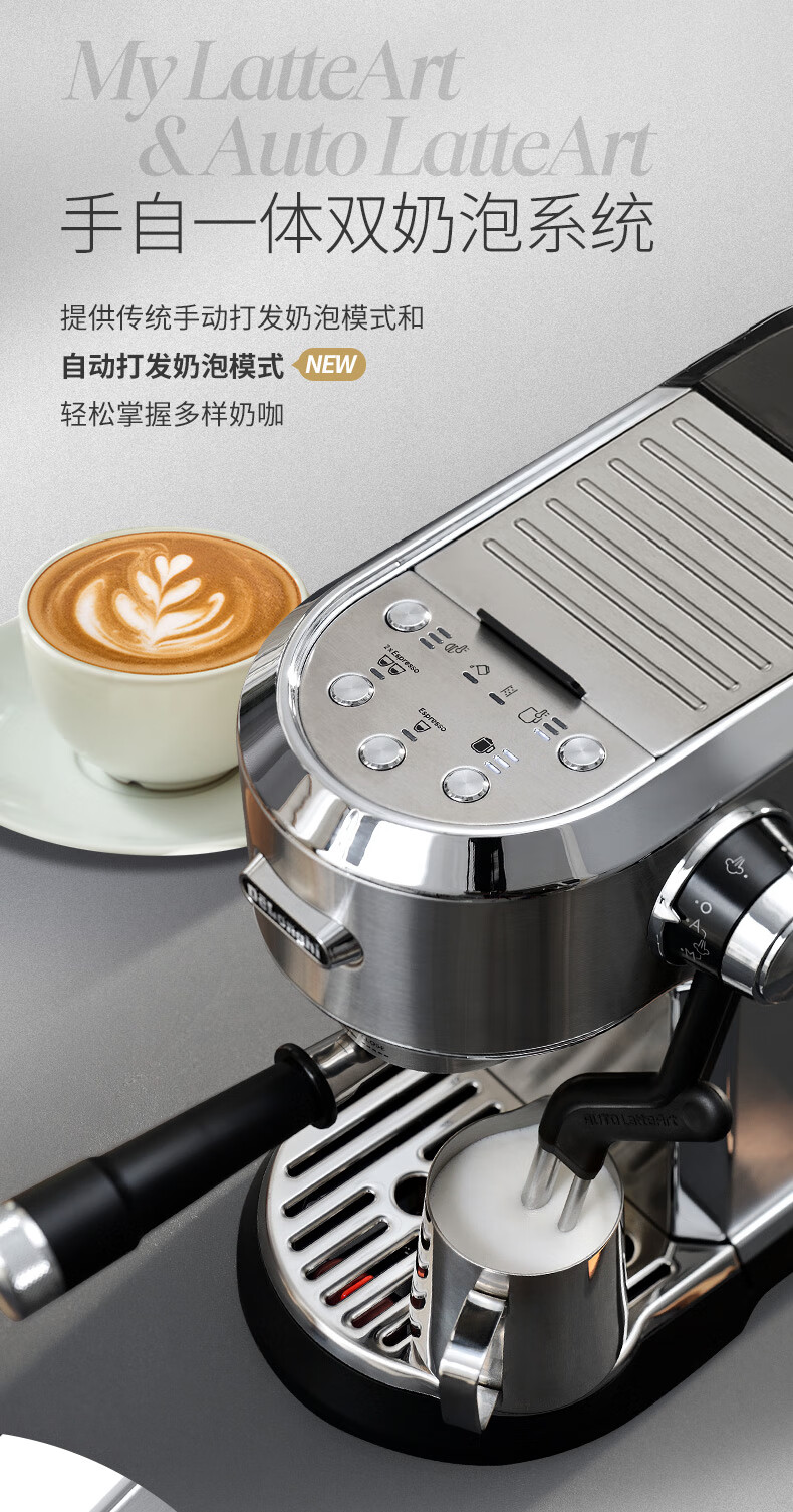 德龙(Delonghi)咖啡机 半自动咖啡机 意式浓缩 家用泵压式 纤巧机身 手自一体奶泡系统 EC950.M 银色