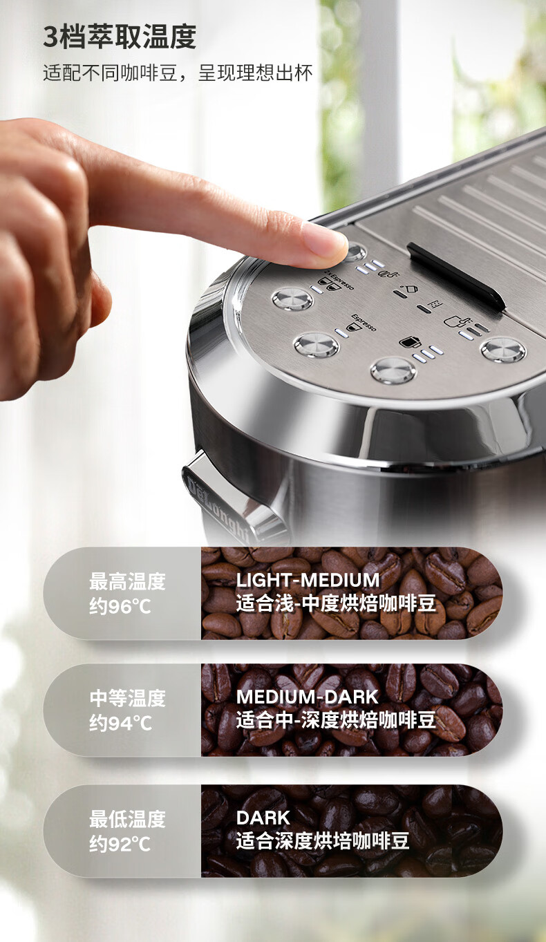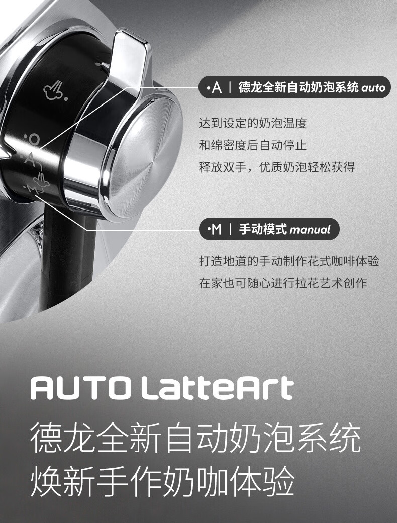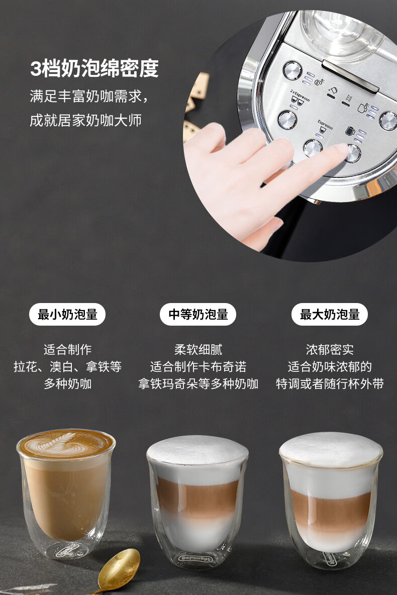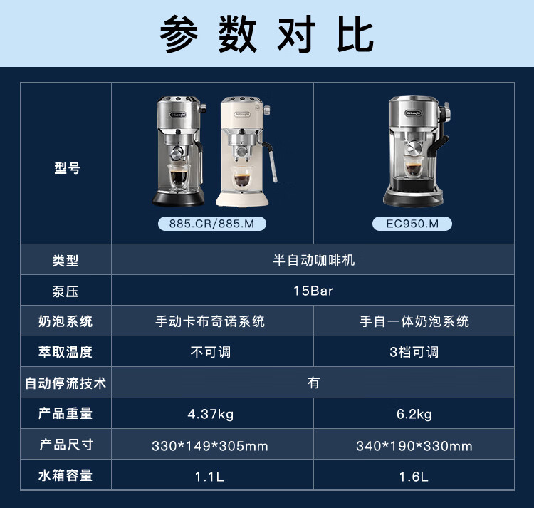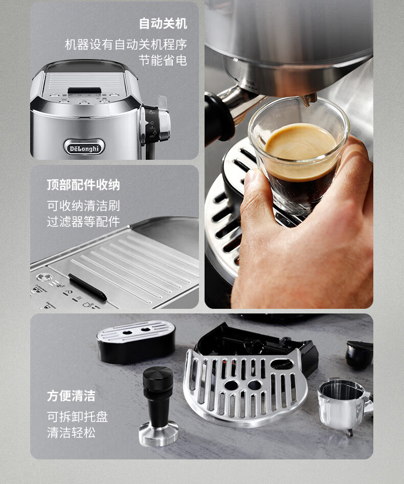 德龙(Delonghi)咖啡机 半自动咖啡机 意式浓缩 家用泵压式 纤巧机身 手自一体奶泡系统 EC950.M 银色