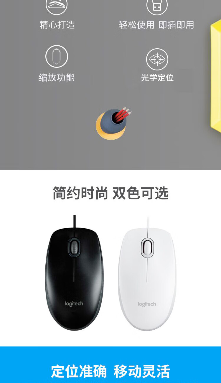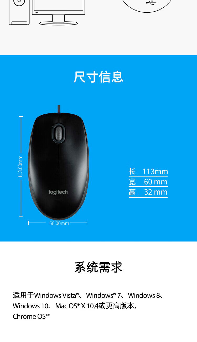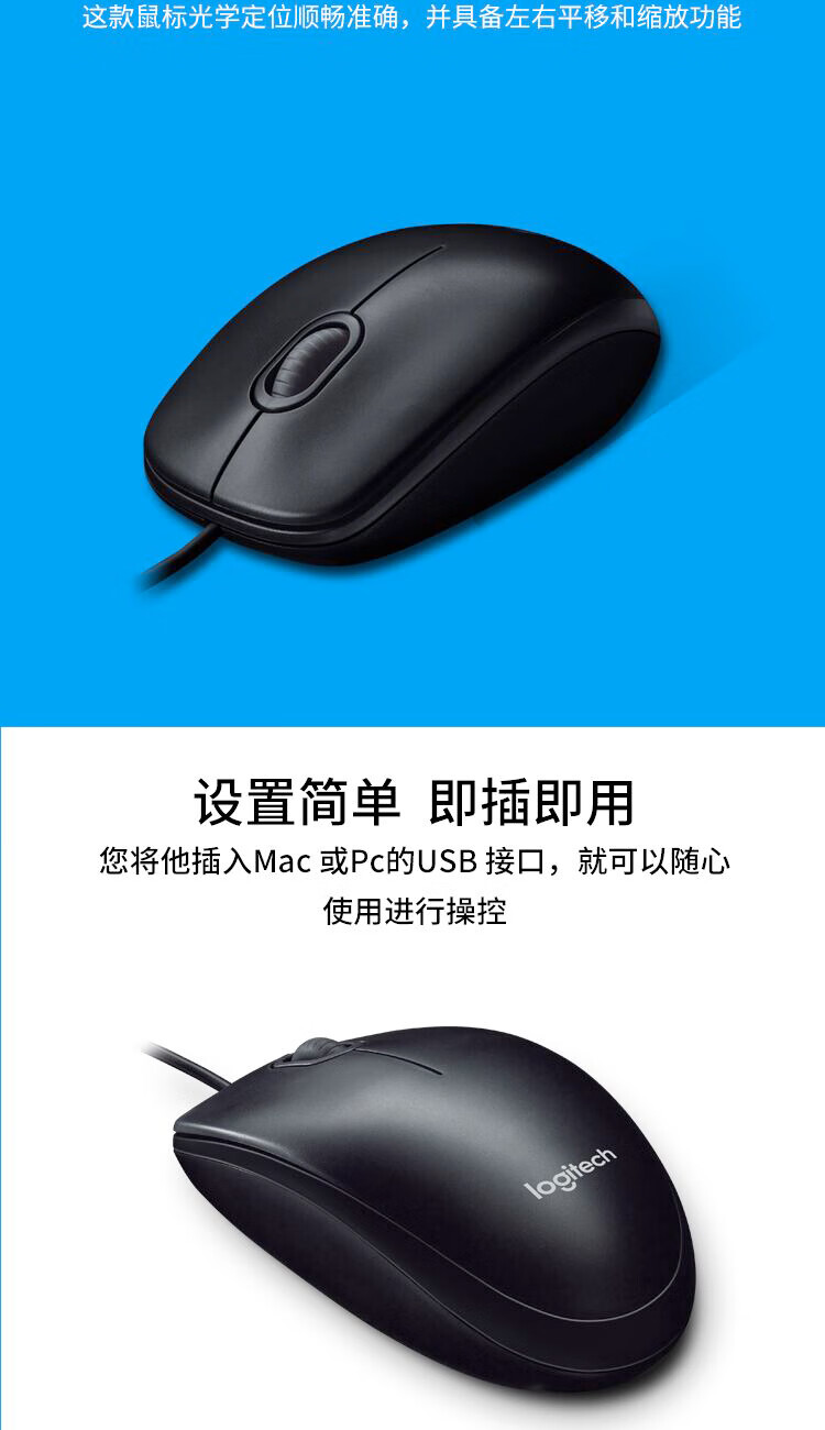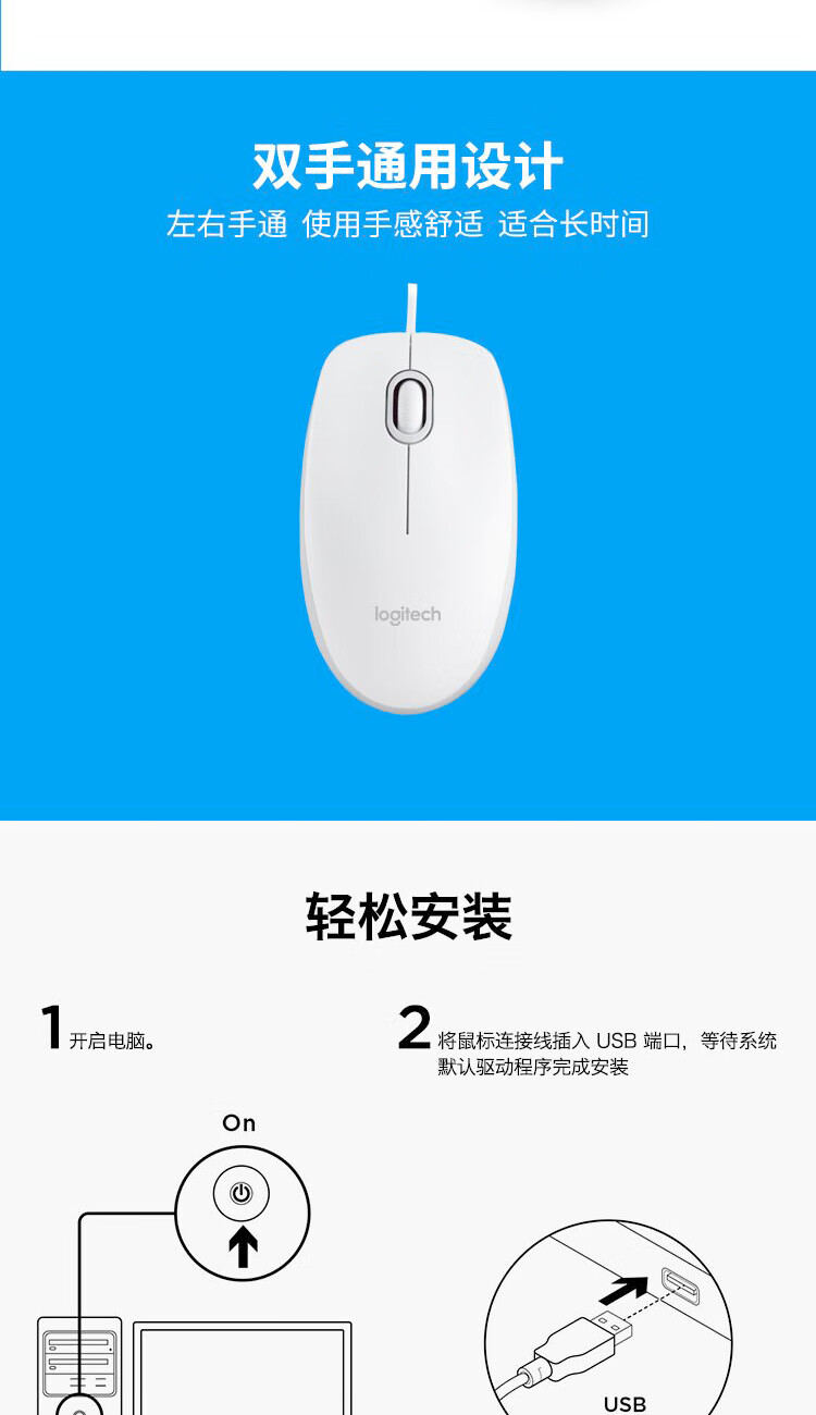 罗技(Logitech)M100r 鼠标 有线鼠标 办公鼠标 对称鼠标 大手鼠标 白色 供电方式:有线供电
