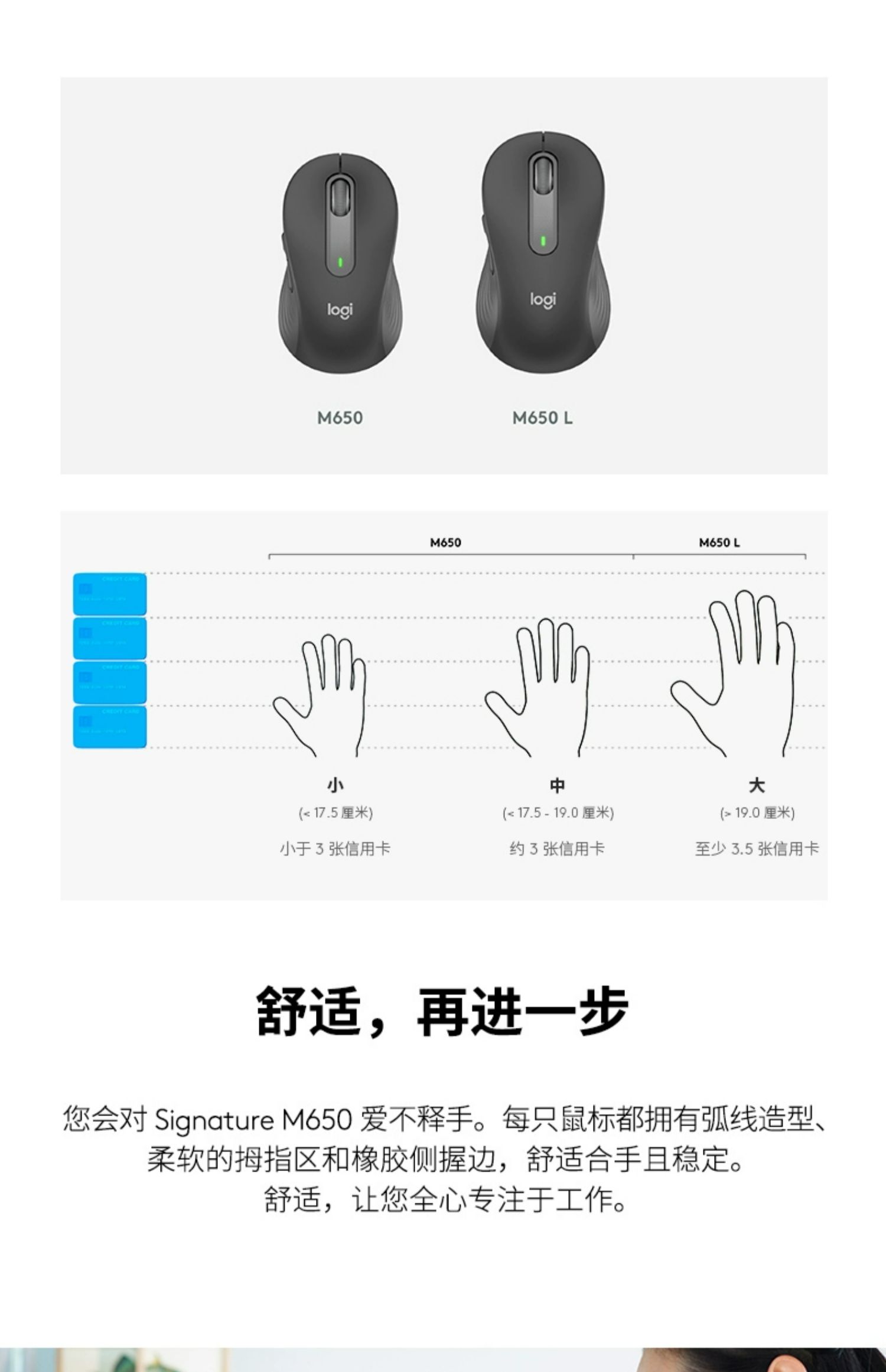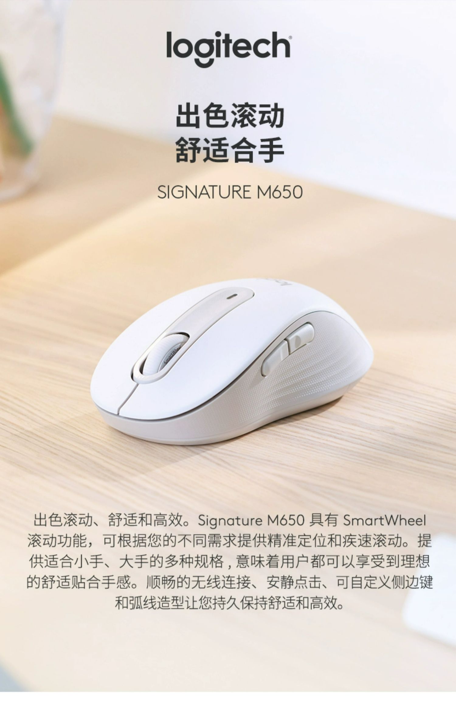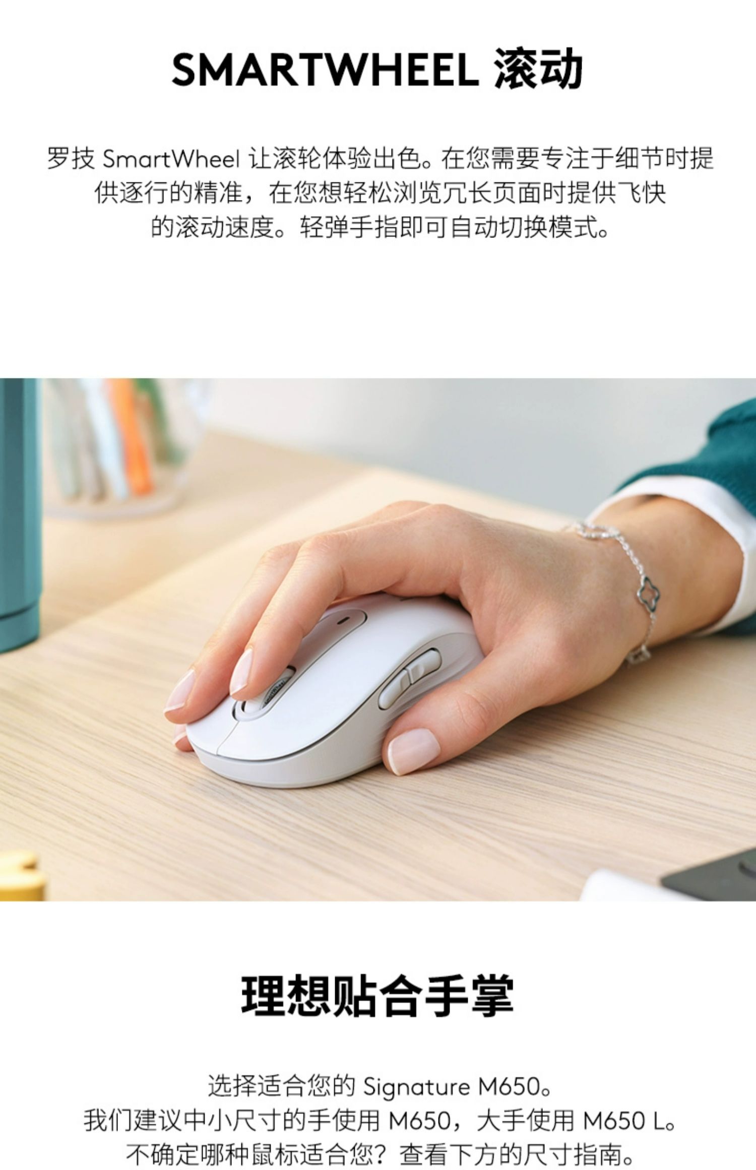 罗技(Logitech)优选系列M650无线蓝牙鼠标 办公蓝牙静音鼠标Mac苹果ipad鼠标人体工学双模鼠标大小手可选男女通用 M650中小手 黑M