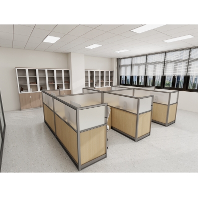2、屏风:屏风厚度≥40mm,铝材厚度≥1.2mm。磨砂玻璃厚度≥5mm。铝合金框架,屏风带铝合金走线板。