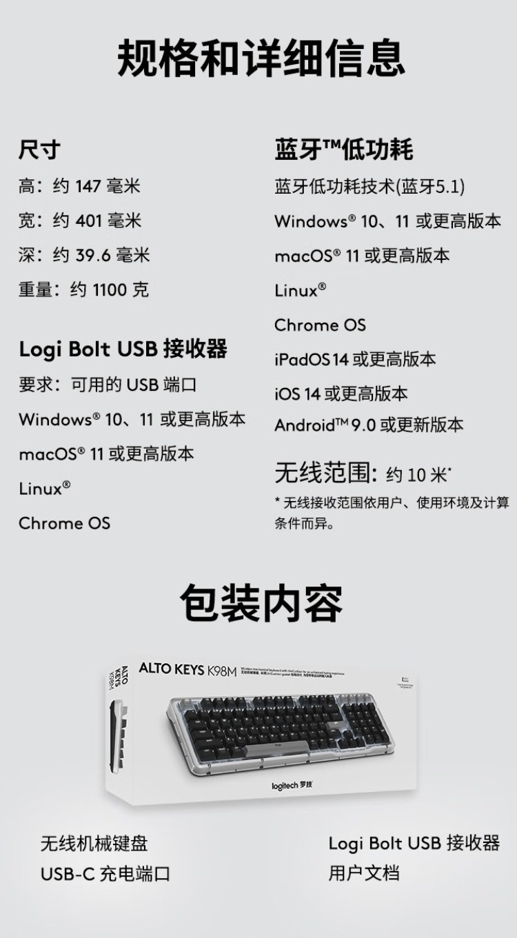 罗技(Logitech)ALTO KEYS K98M 琥珀系列 AI客制化无线机械键盘 热插拔大理石轴 黑色